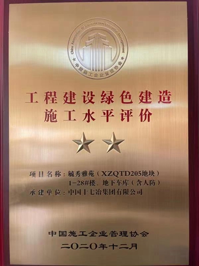 10月31日,中国十七冶集团城建分公司收到中国施工企业管理协会证书,由公司承建的合肥毓秀雅苑项目获评“工程建设绿色建造施工水平评价二星级”。