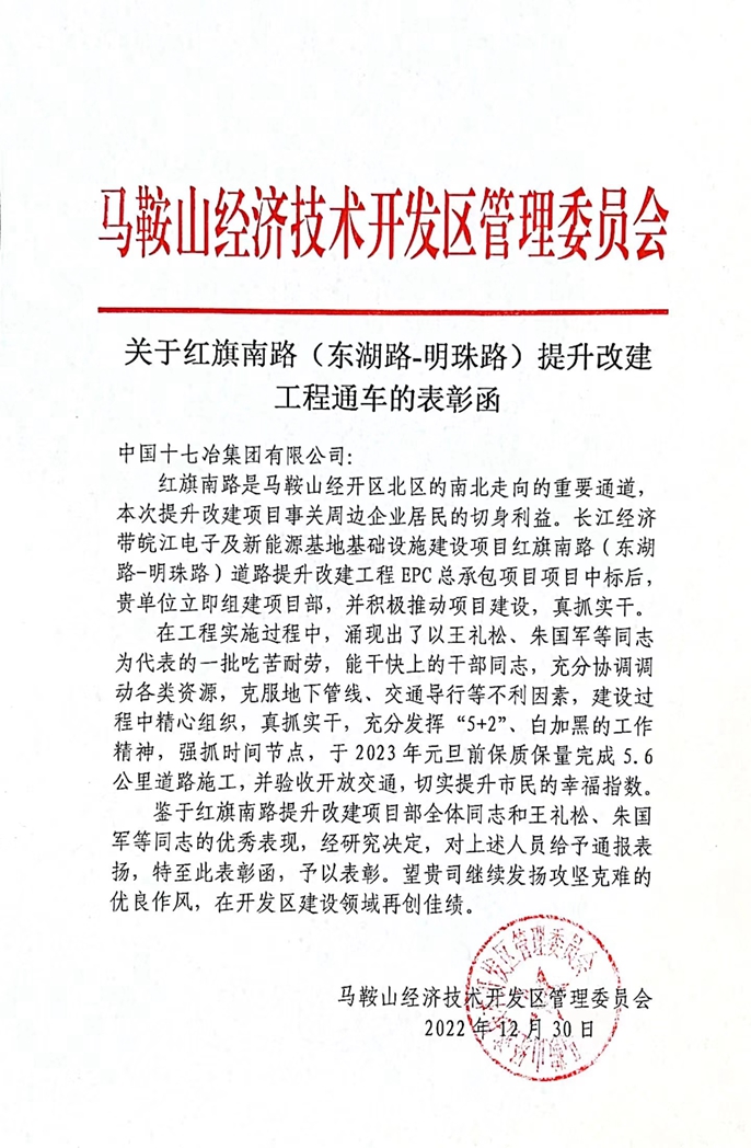 近日,马鞍山市经济技术开发区管理委员会向中国十七冶致表扬函,对房屋分公司红旗南路提升改建项目团队真抓实干、再创佳绩的表现予以高度评价并致以衷心感谢。
