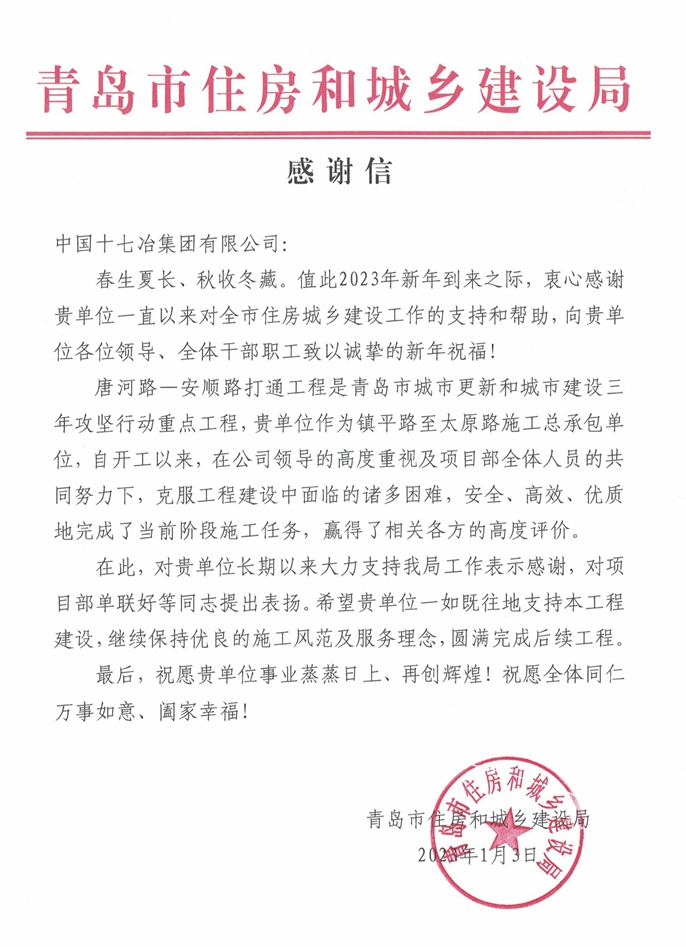 近日,青岛市住房和城乡建设局向中国十七冶致感谢信,对青岛分公司唐河路-安顺路打通工程项目部始终保持优良的施工风范和服务理念,为青岛市城乡住房建设工作提供支持帮助给予表扬并致以衷心感谢。