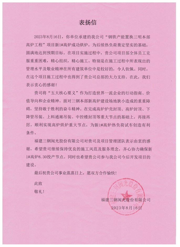 8月16日,福建三钢闽光股份有限公司向中国十七冶集团致表扬信,对冶金分公司福建三明三钢项目团队如期完成新1#高炉烘炉节点表示由衷的感谢。