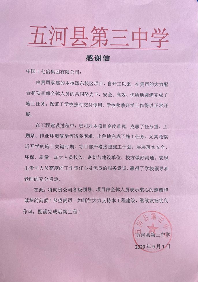 9月1日,五河县第三中学向中国十七冶集团致表扬信,对市政分公司五河县漴东新区初中新建项目保质保量如期交付给予肯定及感谢。
