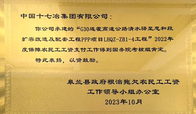 10月9日,兰州市皋兰县政府根治拖欠农民工工资工作领导小组办公室向中国十七冶集团授牌表彰,对G30连霍高速LHQZ-ZB1-3、LHQZ-ZB1-4项目团队保障农民工工资支付工作受国务院考核组肯定给予表扬。