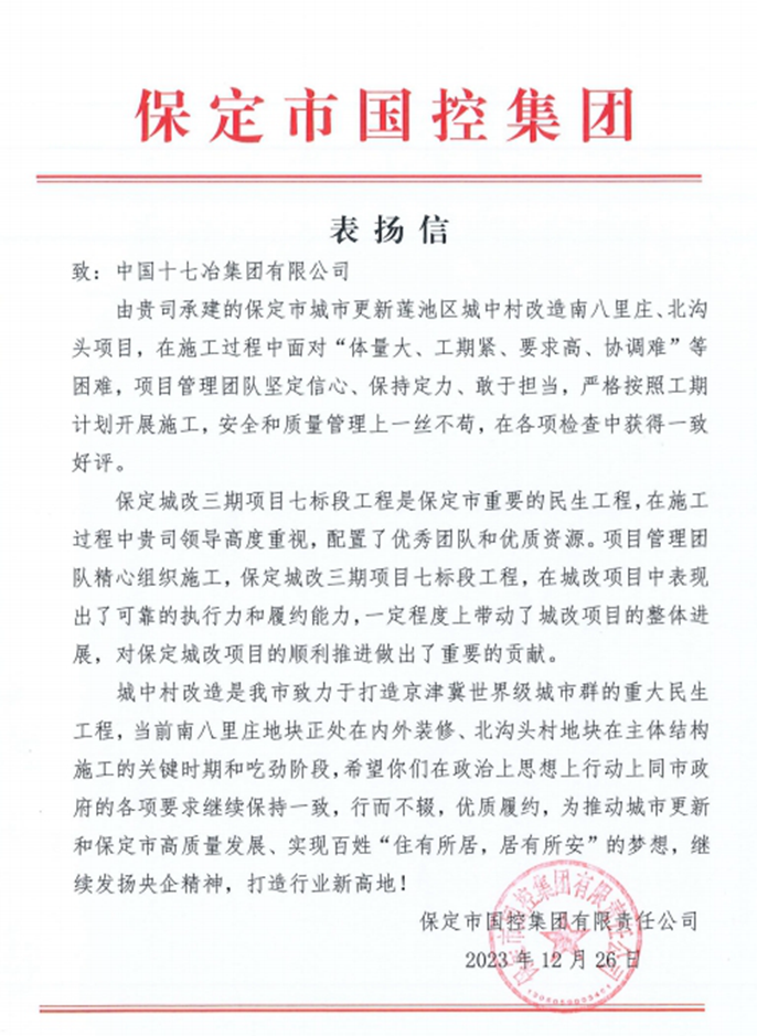 12月26日,保定市国控集团有限公司向中国十七冶集团致表扬信,对房屋分公司保定城改三期七标段项目团队严格按照工期计划开展施工,安全和质量管理上一丝不苟,在各项检查中获得一致好评提出表扬。