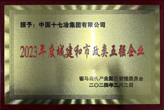 近日,宿马现代产业园区管委会授予中国十七冶集团“2023年度城建和市政类五强企业”称号,并致表扬信对房屋分公司宿马片区项目优质高效推进工程建设予以肯定。