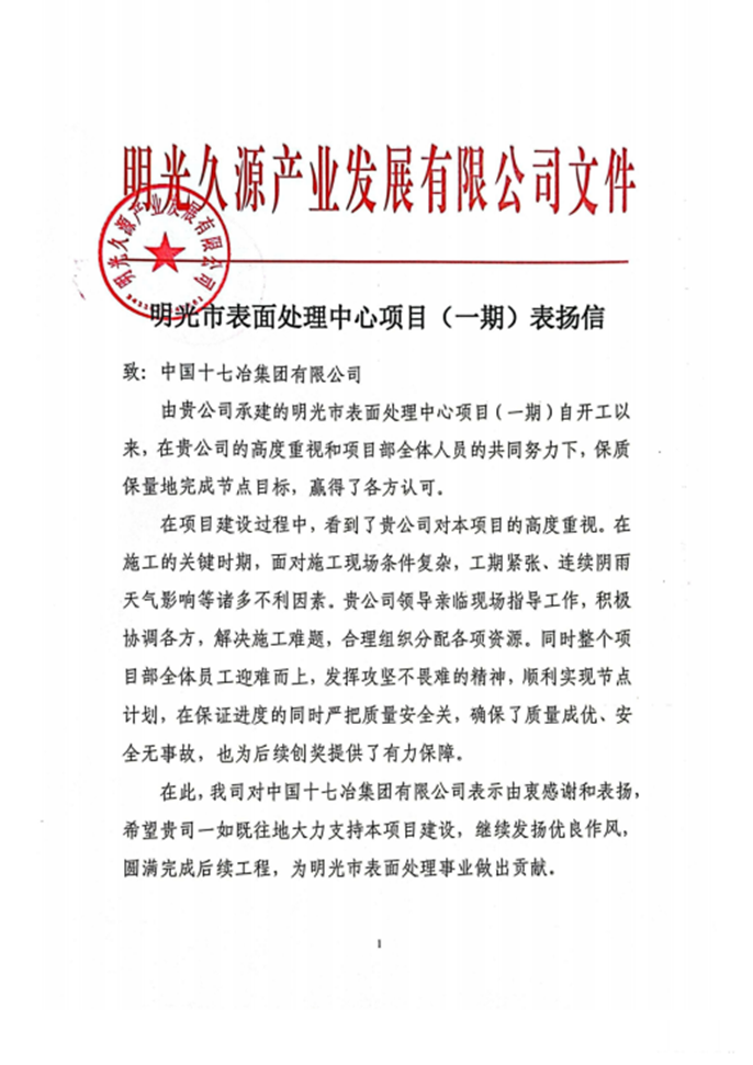 12月31日,明光久源产业发展有限公司向中国十七冶集团致表扬信,对城建分公司明光表面处理中心(一期)项目团队保质保量完成各项节点表示感谢。