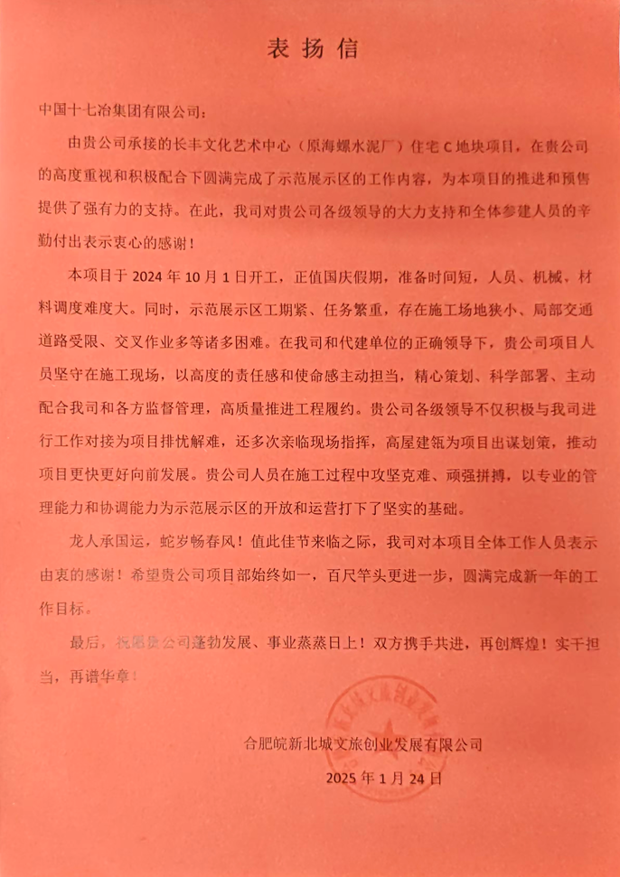 合肥皖新北城文旅创业发展有限公司向中国十七冶致表扬信
