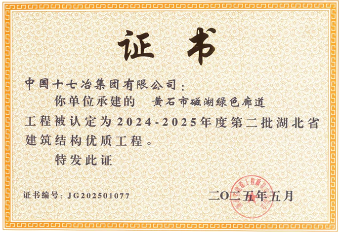 近日,中国十七冶承建的黄石市磁湖绿色廊道工程自斩获“黄石市优质结构工程”、入选湖北省智能建造试点工程后,获评2024 - 2025年度第二批“湖北省建筑结构优质工程”,彰显了卓越工程品质与精益建造理念。