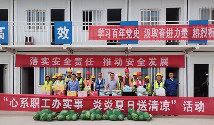 分公司工会主席冯绪林带队前往各项目部,将藿香正气水、人丹、西瓜、矿泉水、冰糖、绿豆等防暑降温物品,分批次发放到一线作业及生产管理人员手中,为生产一线员工送去清凉和健康。所到之处,他们与奋战在生产一线的员工亲切交谈,详细询问他们的工作和生活情况,对大家不畏酷暑坚守工作岗位的精神表示称赞和感谢,并嘱托项目部要统筹协调,在保证项目建设进度的同时,加强疫情防控力度,关注职工身体健康,科学安排作息时间,注意防暑降温措施,全力确保安全生产。