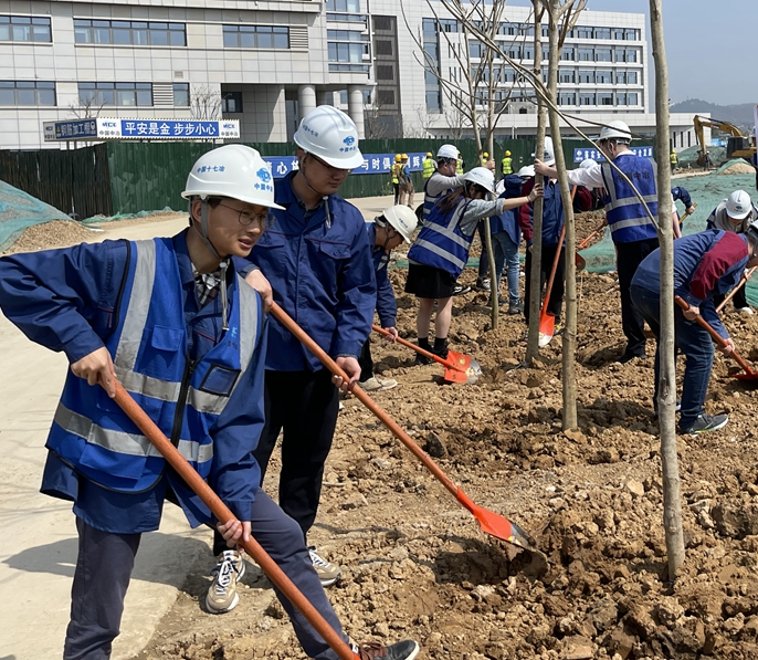 同日上午,在马鞍山市秀山医院项目,30多名青年一起参加了义务植树活动。活动中,志愿者们三五一组,热情高涨,挥锹铲土,植入树苗,培实新土。大家相互合作,尽心用力,各个环节衔接有序,栽下一株株苗木,不到半天时间,众人便合力为即将建成的新医院种下一排排香樟树,现场一片盎然生机。