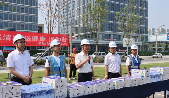 近日来,全国各地持续高温酷暑,为切实做好夏季防暑降温工作,更好地关爱一线员工身心健康,8月10日,西安金港鼎盛置业有限公司总经理吴晴冬,副总经理解宝金、邓必晖一行到中国十七冶在建中冶集团西北区域总部项目、中冶德贤府邸项目慰问奋战在高温酷暑一线岗位上的职工,为劳务人员送上西瓜、苏打水等防暑降温物品。