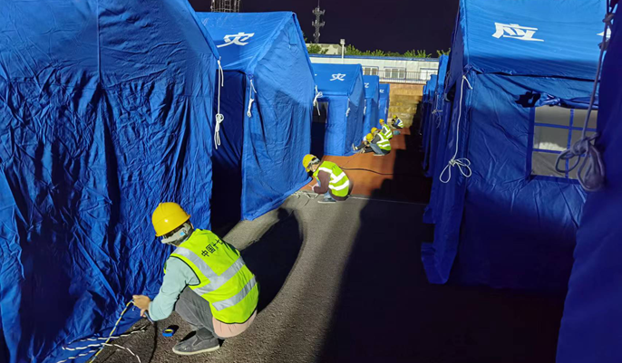 面对困难,现场工作领导小组不等不靠,现场召开部署会,布置工作分区和进度要求,协调现场电箱、电缆、围挡、水码等物资设备的进场和摆放,从铺设线缆、安装配电柜、安装给水管、安装防潮垫,到摆放床褥、枕头、水电测试、场地清理等,每项工作都在最短时间内找到处理的最佳办法,并有效得以实施。连续奋战48小时,经过全体人员的不懈努力,最终任务圆满完成了2500个隔离帐篷的通水通电及室内装饰工作等,隔离点如期交付,为打赢抗疫阻击战提供了坚实有力的保障。