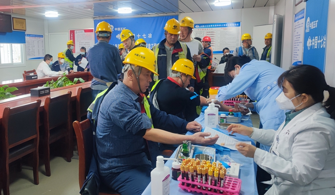 体检现场,作业人员排好队形、有条不紊地逐一进行血常规、血压、心电图等项目检测,医护人员耐心解答工友们提出的问题,并为他们普及职业病预防及健康生活等知识,尤其叮嘱感染过新冠病毒的工友们一定要多关注自己的身体健康情况,发现不适要立即就医。现场的工友们脸上挂满笑容:”以前总是忙着工作,没有时间体检,今天能享受到免费的上门服务,真是太好了!”